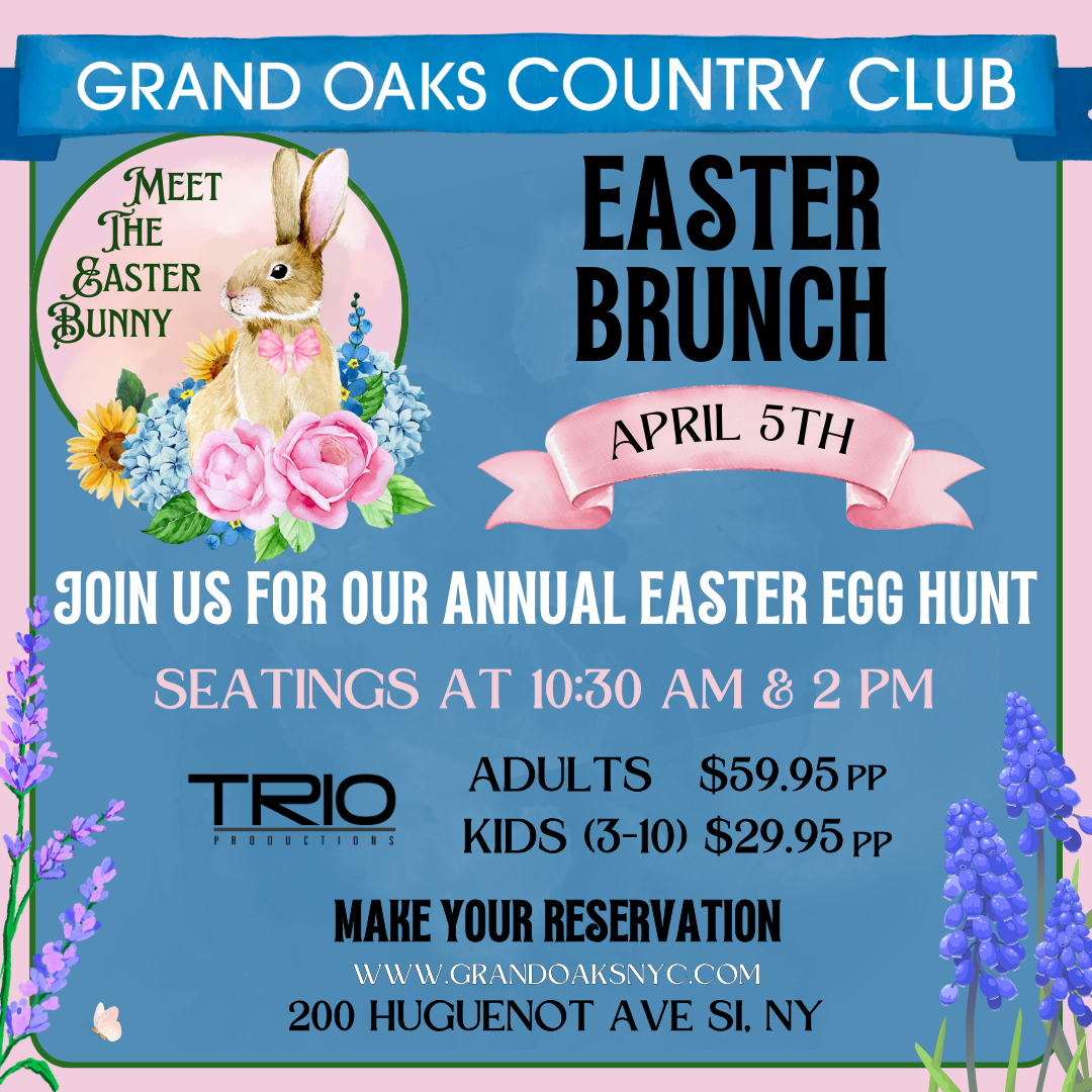 This holiday, enjoy an unforgettable Easter at Grand Oaks Country Club! ๐ถ Live DJ entertainment, the Easter Bunny, and festive fun like our annual egg hunt makes this an experience the whole family will love. ๐ฅ๐ฃ Enjoy a delightful brunch buffet with a cash bar, all in an elegant setting fitting for the occasion. Join us on April 5th, Two seatings: 10:30 AM & 2 PM.